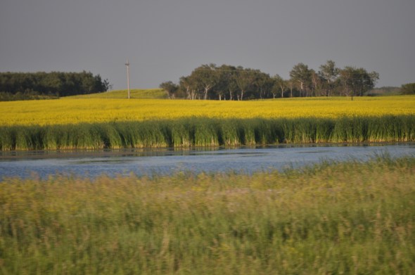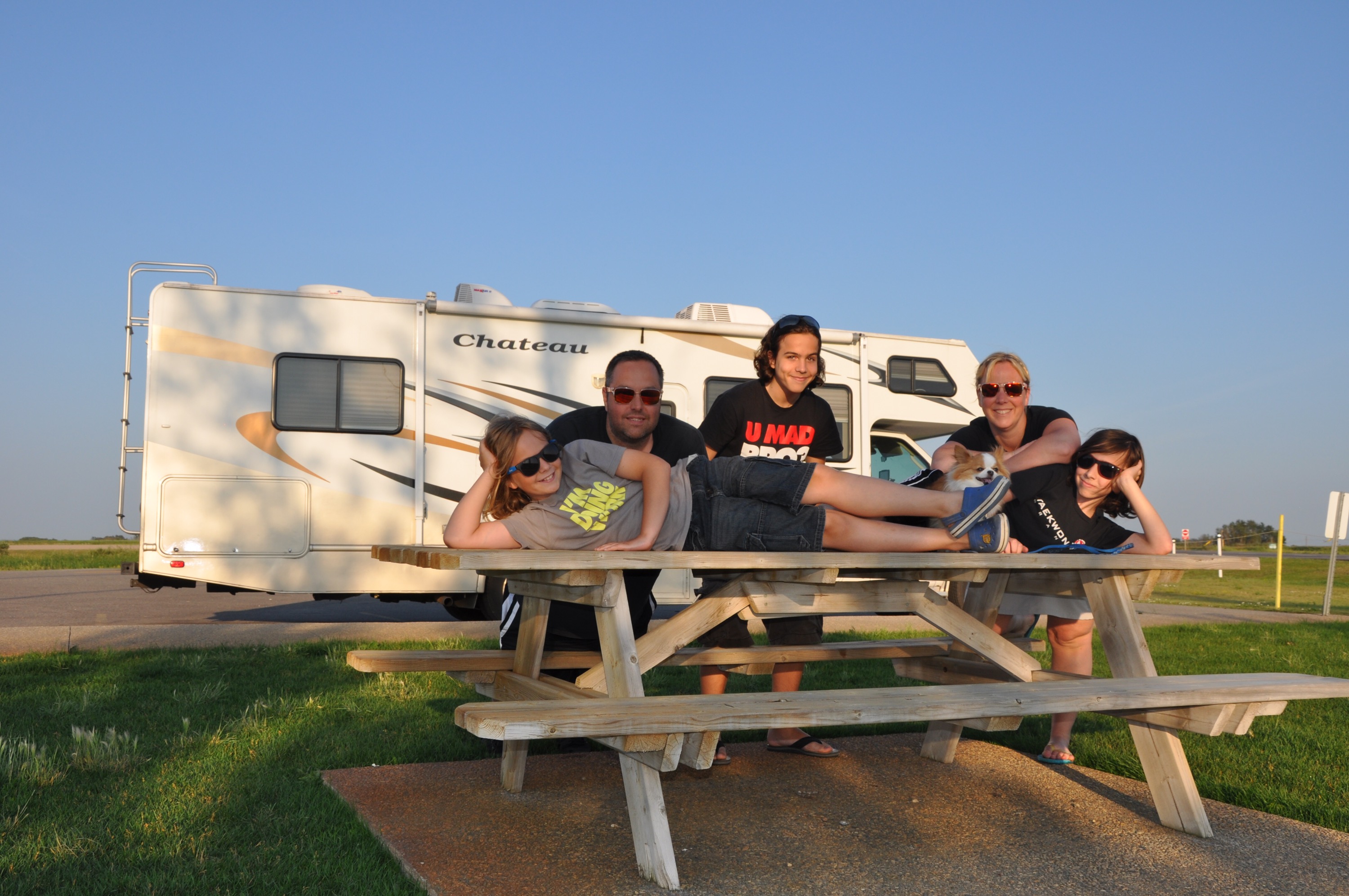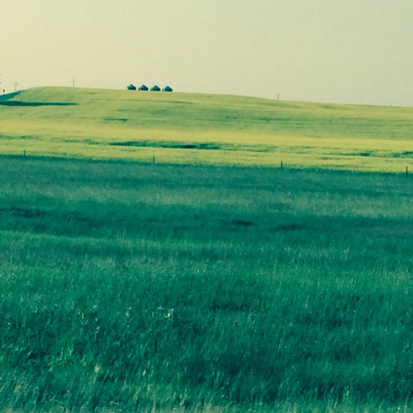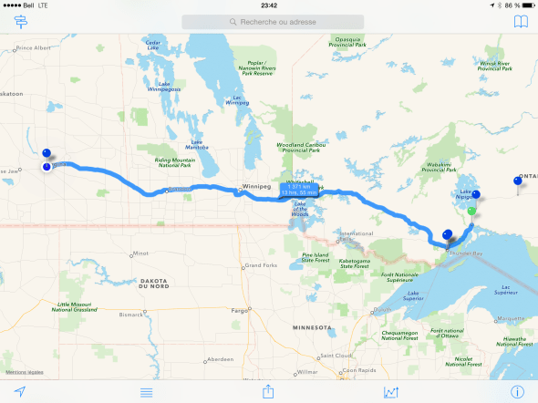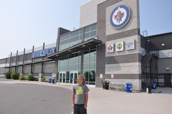 À notre réveil à 6h, on entend les oiseaux (venant du bois à notre droite) et les vaches (venant de la van à notre gauche) ! Lorsque dans une journée on roule pour passer 2 fuseaux horaires et trois provinces … C’est une assez grosse journée. Le paysage a passé d’une vue splendide du Lac Supérieur à Thunder Bay, à des forêts de conifères, à des terres agricoles ressemblant vraiment au paysage de l’autoroute 10 vers Marieville, à des champs jaunes éclatants de plants de canola en fleur. Nous saluons le Manitoba et décidons de passer centre ville à Winnipeg question de faire une visite éclairé de la capitale de cette province. Nous arrêtons même voir pour Yoan le training center des Jets ! Ensuite la Saskatchewan. Yes, la limite de vitesse passe de 90km/h (depuis l’Abitibi), à 100km/h et même 110km/h au Manitoba et en Saskatchewan. Par contre, nous arrivons mal à nous habituer au fait que plein de petites rues secondaires croisent la route. Ici et là, les autos entrent et sortent de la Transcanadienne, en plus de prendre soin des courageux cyclistes qui tentent de « crosser le Canada » en vélo malgré cette chaleur ce 33 degré. Nous apprécions grandement qu’il n’y ait vraiment pas beaucoup de trafic ( rien à voir avec la route vers le sud des USA à pareille date ). Nous pouvons dire mission accomplie aujourd’hui avec une distance parcourue de 1380km ! Nous dormons cette nuit dans un truck Stop Husky à Régina. Il est peut être que 23h ici mais dans notre corps … La journée se fait tard !
