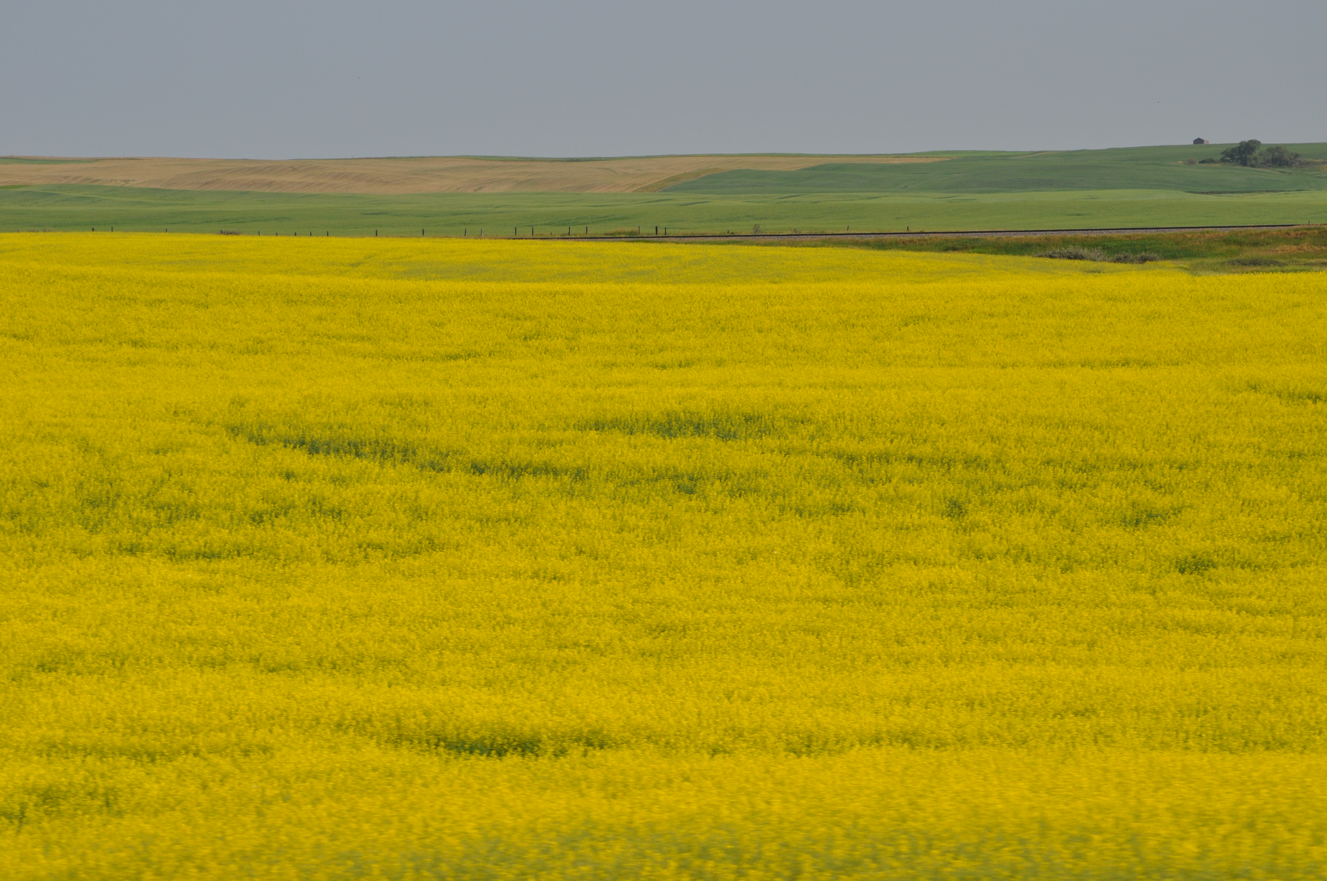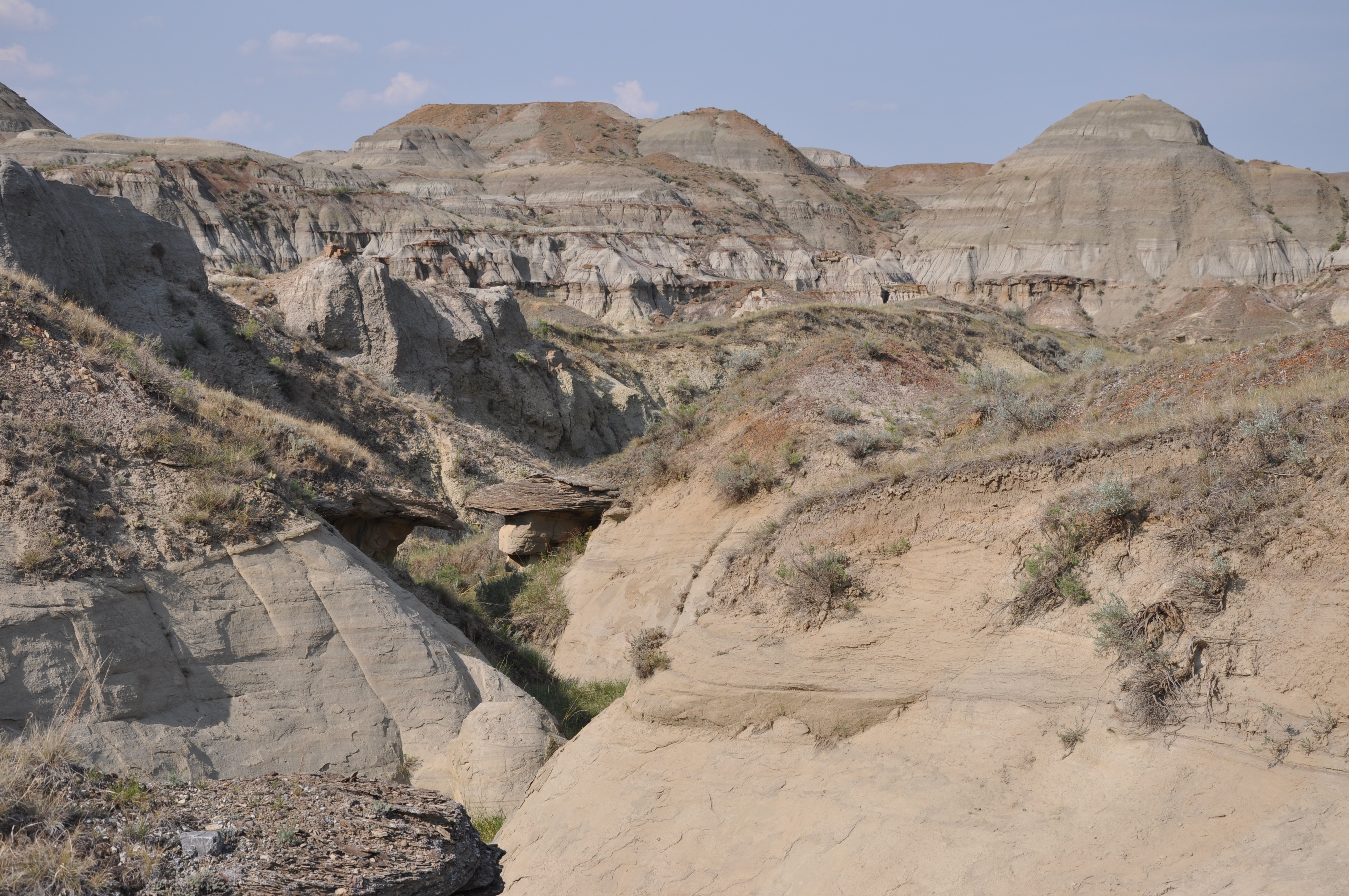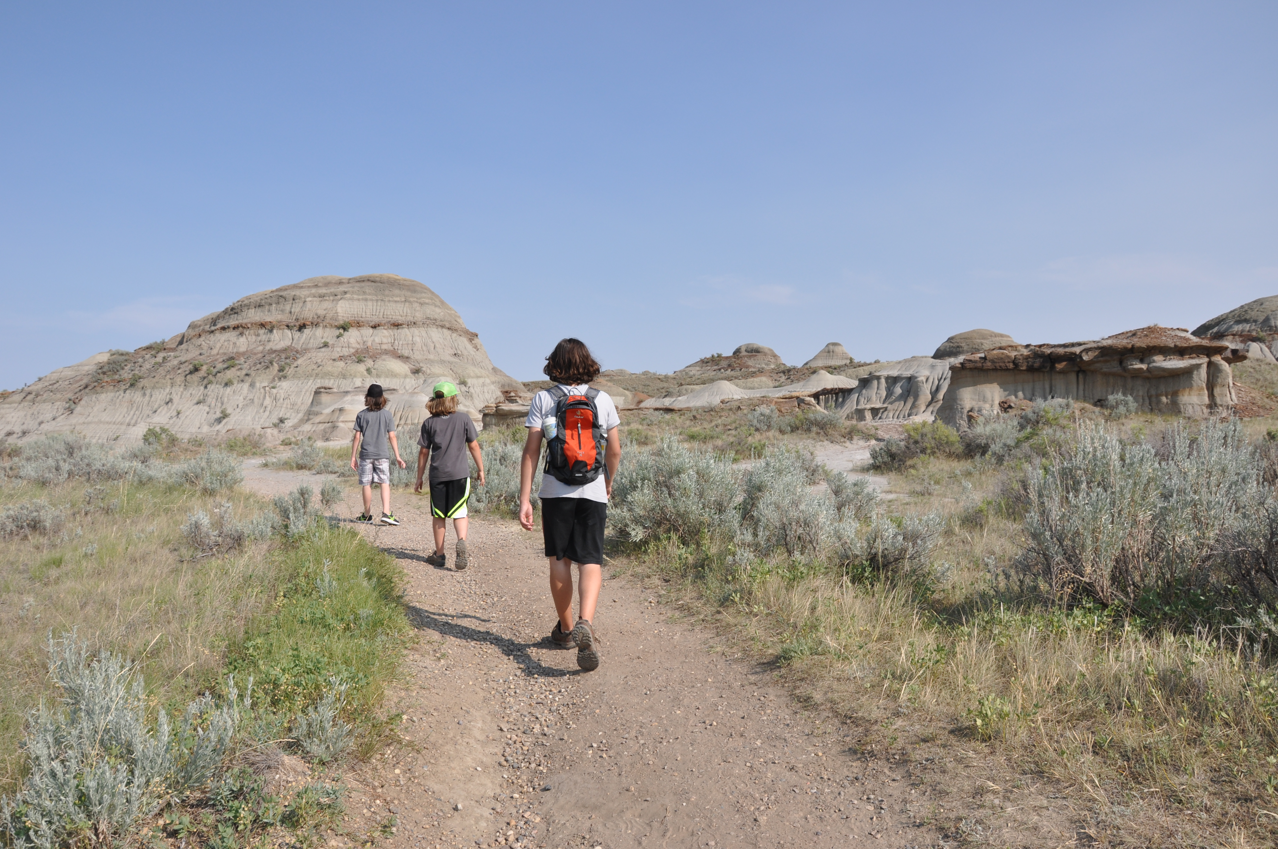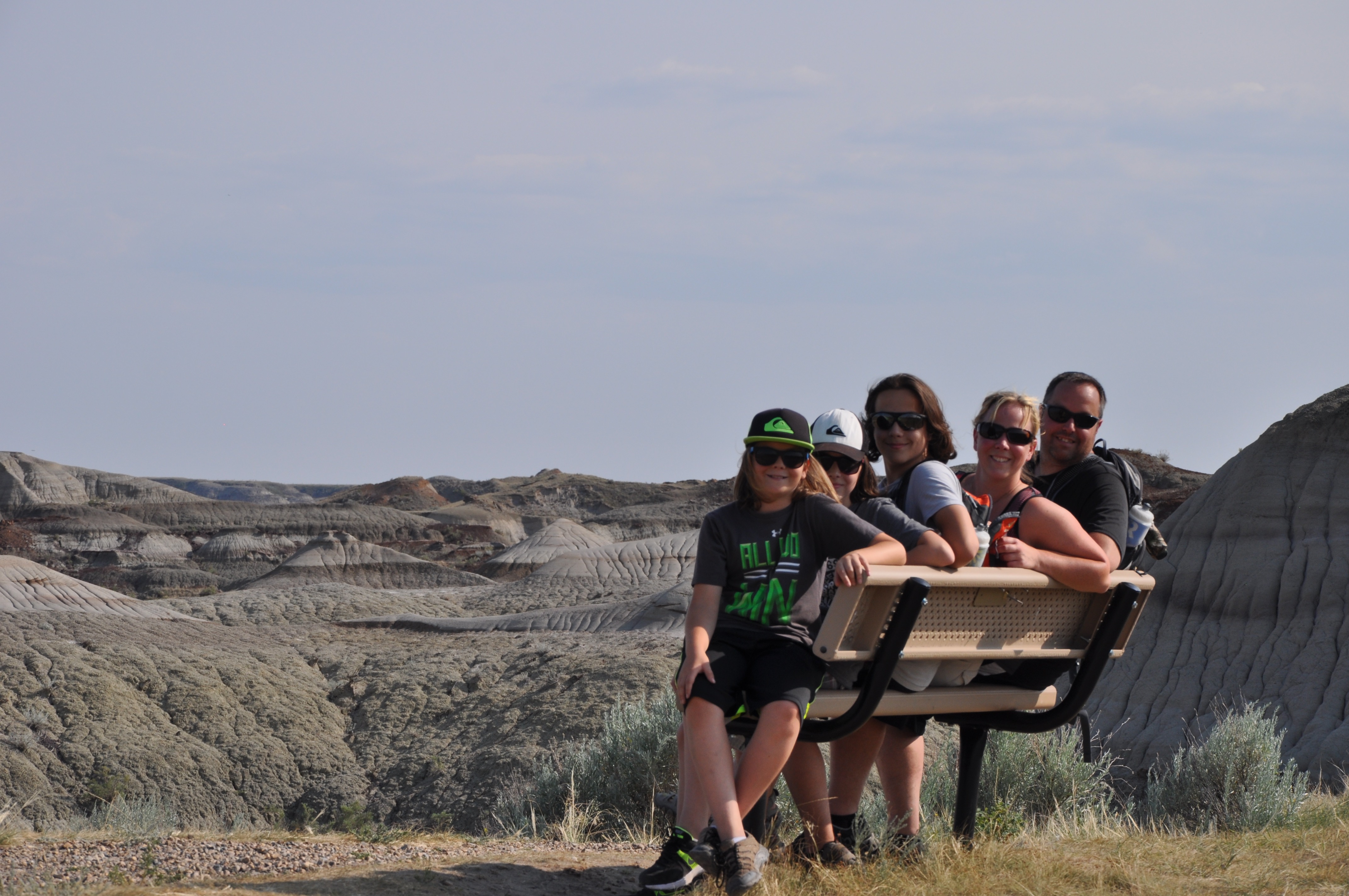 De Régina, nous poursuivons notre conquête des Prairies pour se diriger vers notre destination de la journée : Dinosaure Provincial Park en Alberta. La prairie du Manitoba se caractérise par des fermes dont les champs sont peints par des contrastes de différents tons de vert et de jaune vif. La prairie de la Saskatchewan se démarque par l’arrivée de vallons et de lacs dont les bordures sont blanches dues à la présence de sodium de sulfate dans l’eau. La prairie de l’Alberta est planche, sèche, accueillant des boeufs et des puits de pétrole. Autant parfois nous nous croyons en pleine campagne des cantons de l’Est, autant certaines images des prairies nous rappellent l’immensité de ce territoire agricole. Nous quittons finalement la Transcanadienne pour se diriger, 50 km plus au nord est de Brooks, au Dinosaure Provincial Park. Cette réserve naturelle est classée site du patrimoine mondial par l’UNESCO. Plusieurs squelettes de dinosaures y furent trouvés et 2 y sont encore (possible de les voir avec visite guidée $$) Nous avions beau s’approcher de notre destination, rien du paysage nous laissait prévoir la beauté de ce que nous allions y trouver. En fait, on se croyait à l’Ange-Gardien. Quand tout à coup, des canyons se dessinent devant nous ! Wow ! Nous prenons une chance d’y trouver un site de camping disponible même si sur le web cela affiche complet. Hourra ! Nous avons une place en dry camping ! Il fait chaud, 36 degrés C. Baignade de pieds dans la rivière (pittoresque jusqu’à ce que Markus poursuivre un serpent), promenade de 2km dans le Badlands Trail (les gars disent que ça leur rappelle les Grand Canyon pour le paysage et la chaleur torride), bon souper spaghetti (avec sauce de Jacques, merci papa), douche (quel bonheur) et dodo bien mérité !