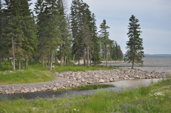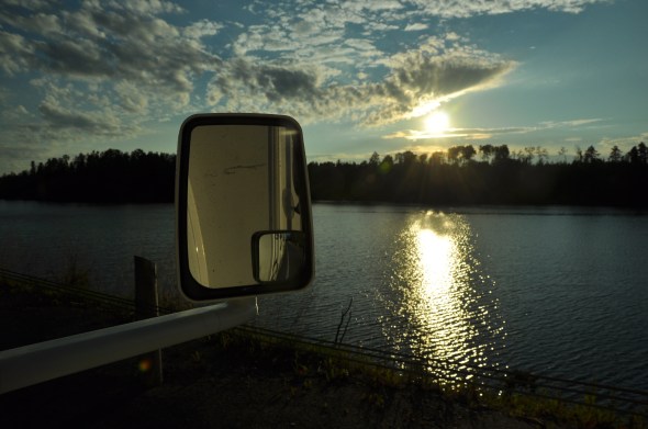 Nous débutons la journée par la traversée du parc de la Vérendrye. Si voyager en VR offre plusieurs luxes à bord, quand la route est raboteuse c’est bruyant et peu agréable et quand l’asphalte disparaît pour construction et qu’un chemin plein de trous nous fait rouler qu’à 30-40km/h un long bout … Pas l’fun du tout ! On durait que tout va casser à l’intérieur! Pour la première fois de ma vie, je dépasse un chasse-terre. Et bien, c’est comme l’hiver : tu as le choix de suivre le chasse-neige qui offre une belle route mais une lenteur à pogner les nerfs ou de le doubler et te retrouver … face à un chemin horrible ! C’est ce que nous avons fait : De la trail en VR ! Nous arrivons en Abitibi, lieu d’origine et de jeunesse des grands-parents à Olivier et de ses parents. Sur les traces de la famille de la Chevrotière/Hamel avec nos 3 gars afin qu’ils deviennent a leur tour passeurs d’histoire de leur origine. Rouyn Noranda, ville ou grand-maman Nicole est née, a étudié, rencontré Paul et s’est mariée. Tout le chemin jusqu’à là a fait revenir aussi des souvenirs d’enfance à Olivier qui s’y rendait plusieurs fois par année y visiter ses grands-parents. Ontario nous arrivons ! Plusieurs témoignages disent que c’est long et plate. Comme nous aimons la forêt, nous avions espoir de trouver cela beau quand même. La réalité c’est que pas vraiment finalement! Conifères et feuillus mais sans plus. Pas vraiment de lacs ou rivières (rien à voir avec la beauté du parc de la Mauricie par exemple). La Transcanadienne est une route qui rencontre mais heureusement pas trop de trafic donc très agréable. Passons Val-Gagné ( lieu de naissance de Paul ! Et oui, un ontarien :-), traversons Hearst (lieu où a grandi Claude Giroux joueur de la NLH). À partir de LongLake, le paysage a complètement changé. Rivières, lacs et montagnes, super beau et en plus, le tout de clarté jusqu’à notre arrivée à 22h30, 1200 km plus tard à Nipigon (où se trouve le port d’eau douce le plus au nord de l’Amérique du Nord). Nous nous trouvons donc au 49e parallèle pour notre dodo de route. On se prépare pour dormir dans un Truck Stop Husky avec d’autres VR ce qui est toujours sécurisant !