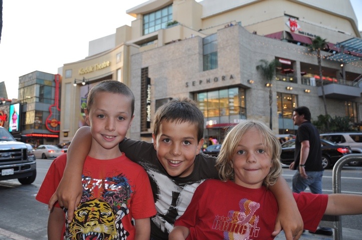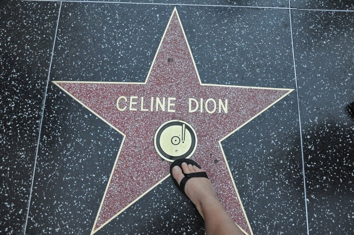 Olivier débute la journée avec un projet qu’il chérissait depuis notre arrivée en Californie : enlever la poussière et les bébites accumulées depuis nos 6000km. Le camping Anaheim RV Village offre un garage prévu pour cette opération. Les gars y ont mis du coeur à l’ouvrage. Ensuite, nous avons profité de la piscine donnant juste devant notre site. Ce camping est celui qui jusqu’à présent, nous offre les meilleurs services. Pour nos visites prévues aujourd’hui, nous louons une voiture. Trop facile, la dame du camping appelle la compagnie de location qui vient chercher Olivier au camping et demain, celle-ci vient reprendre la voiture sur notre site ! Merveilleux ! Nous allons donc faire la tournées des grands classiques de la région de L.A. Premièrement,Rodeo Drive à Beverly Hills : beau et glamour mais … Pas très longue finalement la partie de la rue où nous pouvons magasiner. Et encore, si nous avions les moyens de magasiner ! Mais bon, Mélanie a trouvé chaussure à son pied. Non pas chez Prada mais des gougounes chez North Face ! Ensuite, c’est la poursuite pour trouver le spot où on voit bien le Hollywood Sign. Nous nous en sommes approchés en empruntant les rues sinueuses à une voie où sont cachés des domaines de rêve. Bref, ce n’est pas ce qu’il y a de plus impressionnant ce H.O.L.L.Y.W.O.O.D légendaire mais cela nous fait réaliser que nous sommes bel et bien à ce lieu culte du rêve américain ! Puis, le Hollywood Bl. avec le Kodac Theatre, le Chinese Theatre, le walk of fames et ses imitations de héros miteux un peu partout sur la rue (au plaisir des gars qui par contre, désenchantaient en les voyant de près). Tout est géant à Hollywood et la grandeur de ces théâtres nous a vraiment impressionnée ! Et qui des étoiles que nous cherchions a le meilleur emplacement, soit directement en face du Kodac Théâtre ? Tom Cruise, Harrison Ford, Bruce Willis ? Et non … c’est notre chère Céline Dion !