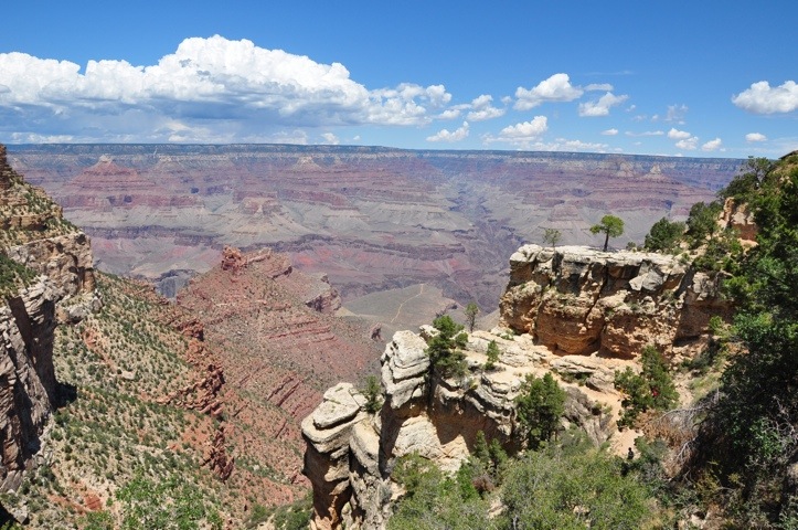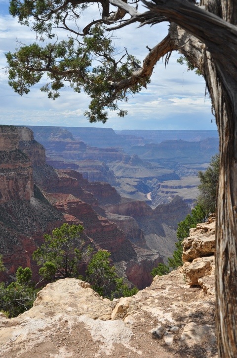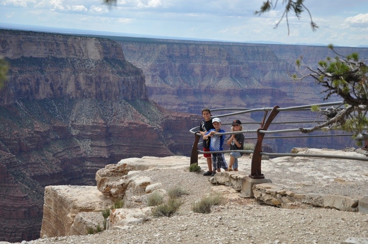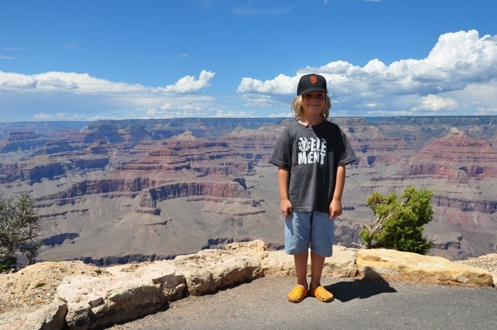 Belle température aujourd’hui pour visiter le parc national du Grand Canyon. Une belle brise et 30 degrés . Nous sommes bien heureux car nous avions peur de suffoquer et de trouver difficile de camper dans le désert sans service ! Mais non, à notre grande surprise, le camping est très boisé et nous y sommes vraiment confortables. Les gars sont heureux : c’est notre premier camping » de bois » cette année ! Pour la visite du canyon ( disons d’une si petite partie du canyon ) le parc offre un service d’autobus qui nous transporte d’un point d’observation à un autre. Idéalement, nous aurions aimé faire du vrai hiking dans les sentiers mais comme nous n’avons qu’une journée et il faut l’avouer, 3 semaines de touring dans le corps, cette option nous convient parfaitement. Quelle merveille ! Les garçons furent eux aussi impressionnés et ont dit mille fois : « Comme c’est beau! ». D’un point d’observation à un autre, nos yeux s’émerveillaient de ce spectacle de la nature. Nous avons pris 6 heures pour parcourir les 9 points d’observation proposés par le circuit d’autobus. Nous y avons même vu des wapitis sauvages tout près de nous. Ce parc national est géant et est une destination vacances où nous aurions pu y passer plusieurs jours. C’est déjà notre dernière journée de visite. Demain, nous entamons le chemin du retour. Un bon souper en nature pour bien profiter de cette belle soirée. Présentement, Loīc est couché mais ne dort pas. Il observe depuis sa fenêtre le champ d’étoiles au ciel offert par la noirceur du parc et n’en revient pas comme c’est beau !