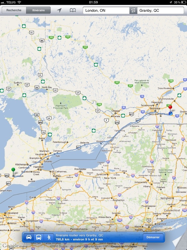 Nous mettons les clés dans le VR pour se diriger vers … la maison ! Une petite visite à Toronto chez la marraine de Yoan s’improvise. Nous nous dirigeons sur Avenue Road pour aller saluer rapidement Sandra et visiter son nouvel appartement. Mais où se stationner dans une rue de Toronto avec un 30 pieds lorsqu’en plus, des travailleurs refont l’asphalte … Avec gentillesse, ceux-ci nous font une place de choix devant leur machinerie le temps de notre petite visite ! Une photo démontre bien cette scène : Remarquez la tour du CN en haut à droite de la photo. Sandra est vraiment bien installée dans ce beau quartier tout près du downtown de Toronto. De retour dans le motorisé, c’est le sprint final. Un petit pincement au coeur lorsque nous entrons au Québec. Nous revoilà dans notre belle province laissant dernière nous un parcours de plus de 12 000km de bon temps en famille ! Arrivés à Montréal, un bouchon digne de cette belle ville nous attend! Pas une fois de tout notre voyage nous avons été coincés dans le trafique de la sorte. Heureusement, le GPS nous a sorti de cet embouteillage de façon impressionnante (car c’est rare que les contournements proposés soient aussi efficaces que cela !) Notre bonne vieille autoroute 10 défile sous nos roues et nous mène jusqu’à chez nous. Mission accomplie ! Un arrêt chez Paul et Nicole nous permet de revivre les joies de notre voyage avec nos récits. Ces retrouvailles rendent la fin de ce périple heureux et enlève cette boule dans la gorge que provoque le désire de poursuivre jour après jour notre voyage ! Nous espérons que ce site vous aura permis de faire un petit bout du voyage avec nous. Partager ces photos et ces textes étaient un réel plaisir. Merci à ceux qui nous ont écrit. Merci de nous avoir lu et d’avoir ainsi été avec nous tout au long de ce voyage. Au plaisir de vous raconter nos aventures de vive voix !